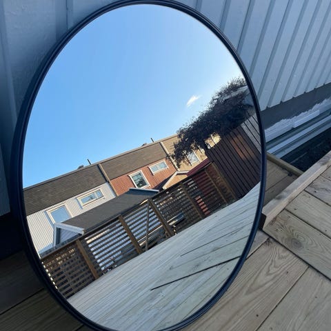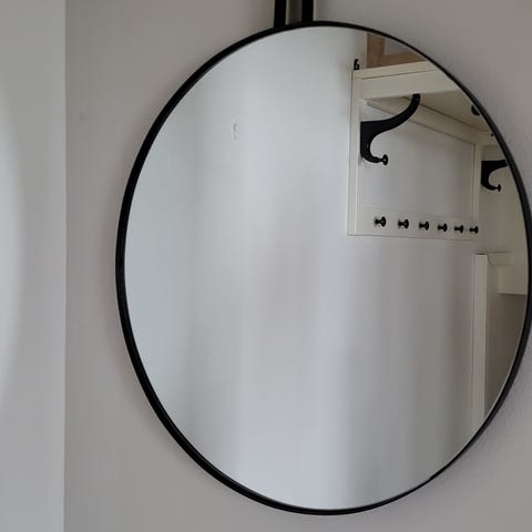 Rund spegel med svart ram. Väggspegel med enkel, cirkelformad design och tunn svart kant. Passar exempelvis i hall, sovrum eller vardagsrum som praktisk spegel och inredningsdetalj.