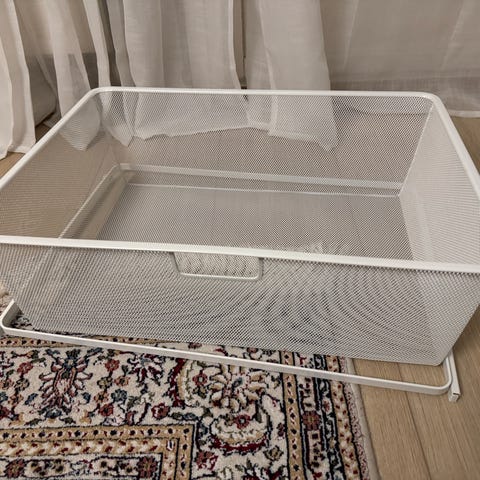 Vardö sänglåda Ikea vit säljes. Locket är i tyg i syntetmaterial som knäpps fast. Hjul under så lådan kan rullas fram och tillbaka under sängen.