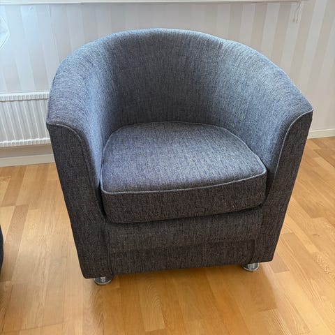 Säljer två fåtöljer i grått tyg med rundad rygg och armstöd i ett stycke. Sits med lös sittdyna och matchande prydnadskudde. Klädd baksida och sidor, passar att placera fritt i rummet. Låg vikt och mörka ben i trä. Mindre slitage, små öglor i tyget på ena fåtöljen på några ställen. Fåtöljerna har primärt använts som avlastning för kläder. Bilderna är tagna i olika rum med olika ljus, därav färgavvikelserna. Köpta på Chilli, kvitto finns ej kvar.