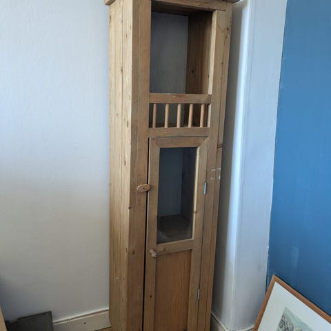 Äldre skåp, mycket smalt. Repor och märken, saknar nyckel.