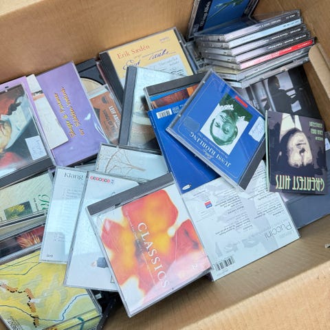 En kartong som innehåller 60 CD-skivor med en salig blandning av olika stilar.