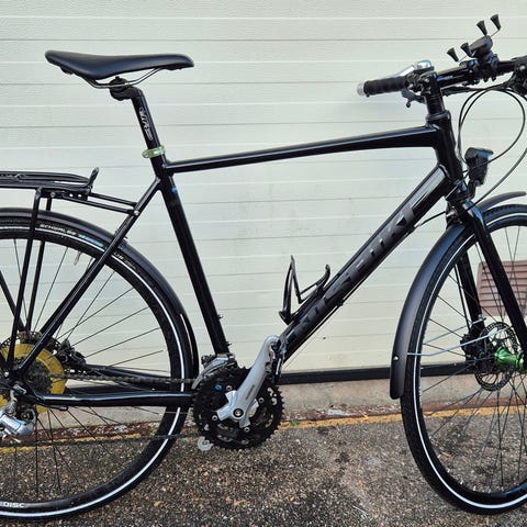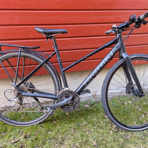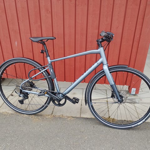 Dark blue Hybrid CRESCENT (High quality brand) bike with brake discs front and rear. 28 inch wheels and 24 gears, aluminium lightweight frame. New mudguards though I am not happy with how they are attatched. NB the low price is because the colour in the photos is missleading, it is a much darker blue and has several small scratches but Everything works but still only 1800kr