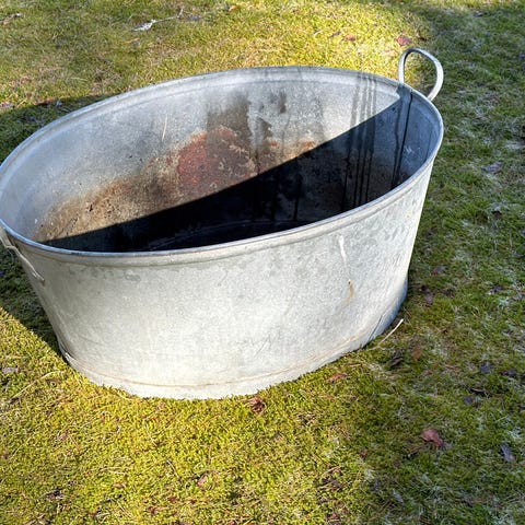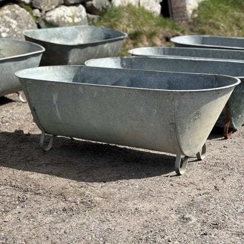 Den större baljan (50 l) har skador i botten och är något ostadig, men fungerar utmärkt som prydnad eller plantering.