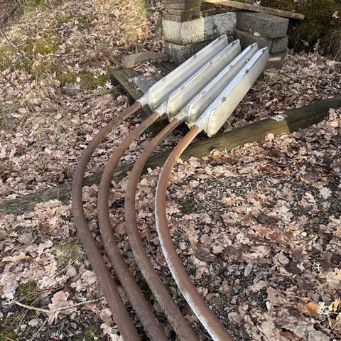 Grått poolskydd i bra skick som passar en pool med måtten 8 x 4 meter.