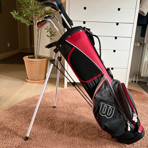 Wilson golfset med bärbag i röd/svart färg. Setet innehåller flera järnklubbor samt minst en wood/driver, placerade i en lätt bärbag med benstativ. Bagen har axelremmar för enkel transport och flera fickor för förvaring av bollar, peggar och tillbehör. Passar för spelare som söker ett komplett set med bag för träning eller spel på bana.