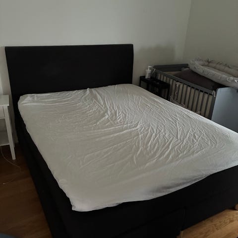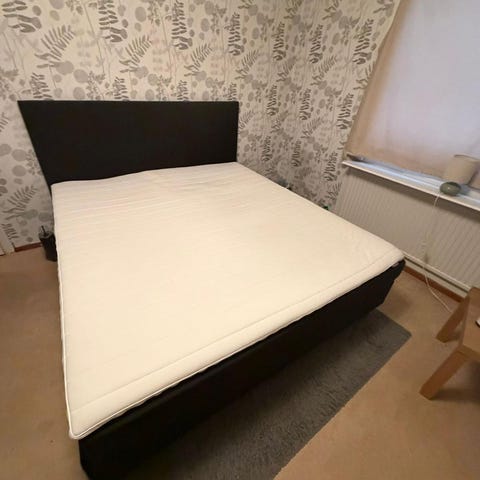 Jysk säng med madrass i svart utförande. Sängen består av en underdel med ben och en övre madrass. Passar som dubbelsäng i sovrum. Överkast eller bäddmadrass i ljus färg ingår enligt bild. Lämplig för två personer beroende på mått och behov.