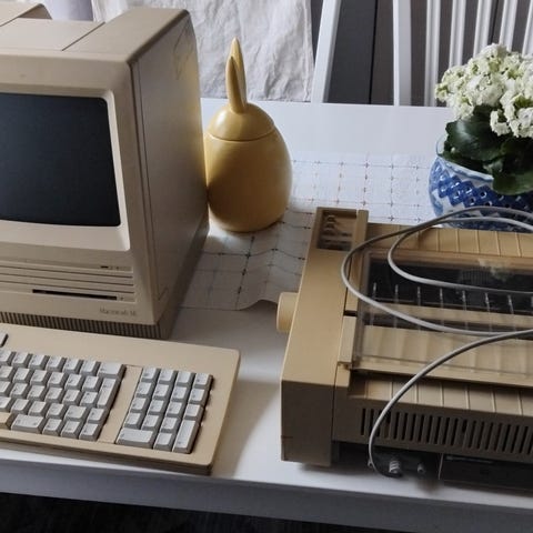 2 st Apple Macintosh Plus stationär dator med tillhörande programvara och dokumentation. På bilderna syns en körande Macintosh Plus med inbyggd skärm och diskettstation. Ovanpå datorn står en Apple 20SC extern lagringsenhet. Till datorn finns manual/bok för Macintosh samt programmet Microsoft Flight Simulator för Macintosh, tillsammans med en bok med tips för Macintosh-användning. Utrustningen är avsedd för stationärt bruk och passar för den som vill använda eller samla klassisk Apple Macintosh-hårdvara och tillhörande program som medföljer. Båda är fungerande och kan provstartas. Skickas inte då frakten blir dyrbar och risk att något går sönder. Ev prisdiskussion sker på plats med köpare.