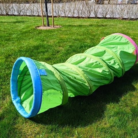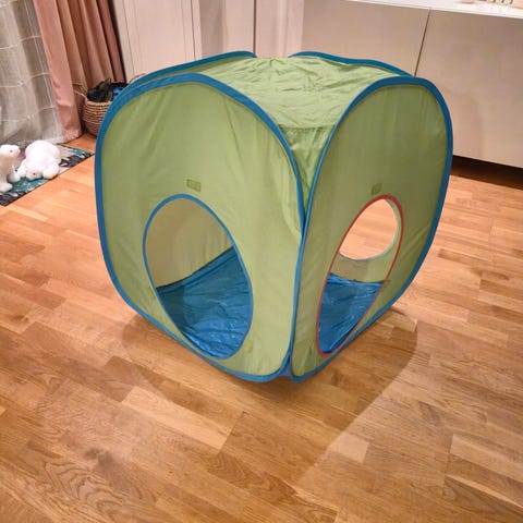 IKEA lektält med lektunnel i grön textil. Tältet kan användas tillsammans med den medföljande tunneln eller var för sig