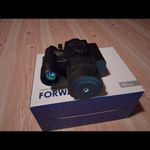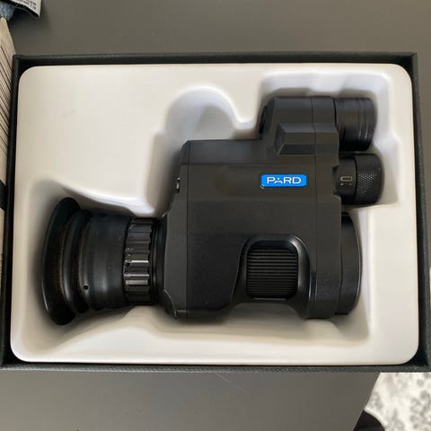 Pard NV007S digitalt mörkersikte med inbyggd IR-belysning på 940 nm som är sparsamt använd. Enheten är avsedd för montering bakom kikarsiktet med snabbfäste.