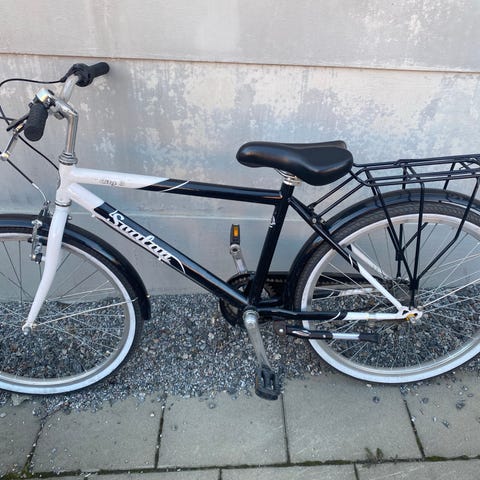Svalan ”city” barncykel med 24" hjul. Cykeln har blå och vit ram, svart sadel och styre. Utrustad med kedjeskydd, stänkskärmar och pakethållare bak.