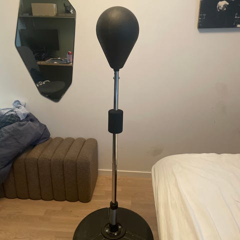 Boxboll på stativ med justerbar höjd. Bollen är tvåfärgad i svart och orange och sitter monterad på en fjädrande stång.