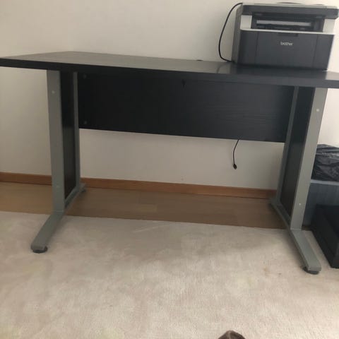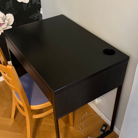 Utfällbart skrivbord med låda och sladdgömma. I använt skick.