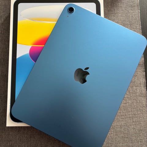 5e generationen iPad Air surfplatta med 64 GB lagringsutrymme. Modellen har en blå baksida