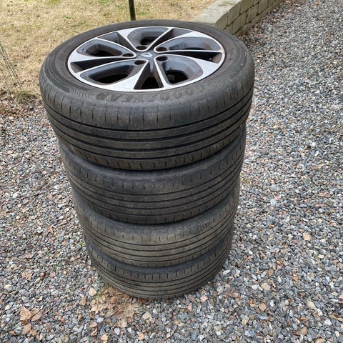 Bild 1:Renault aluminiumfälgar med monterade sommardäck (äldre). Fälgarna är av lättmetall med fler-ekrad design. Däcken är monterade på fälgarna och säljs tillsammans som sats. Lämpliga som kompletta hjul till personbil från Renault, kontrollera bultmönster, dimensioner och däckstorlek mot din bil innan användning. 5x114,3 Nav:66,1. 2000:-
