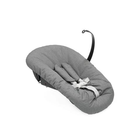Tripp trapp newborn set i grå textil med vadderad sits och integrerat säkerhetsbälte. Dynan är formad för att ge stöd åt spädbarn och småbarn och kan användas som insats i en tripp trapp barnstol. Passar för inomhusbruk och är avtagbar och tvättbar.