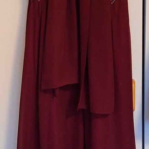 Säljer en vinröd aftonklänning/balklänning som kan passa perfekt till studentbalen. Klänningen har lite vidd, slätt tyg framtill och bak är det infällt mönstrat tyg, vilket syns under snörningen. Axelbanden är avtagbara.