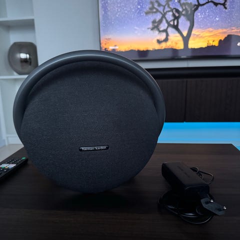 Harman Kardon Onyx Studio trådlös högtalare i vit färg. Rund bärbar högtalare med inbyggda ben och bärhandtag på baksidan. Levereras med nätadapter enligt bild. Passar för trådlös uppspelning av ljud i hemmet eller på kontoret.