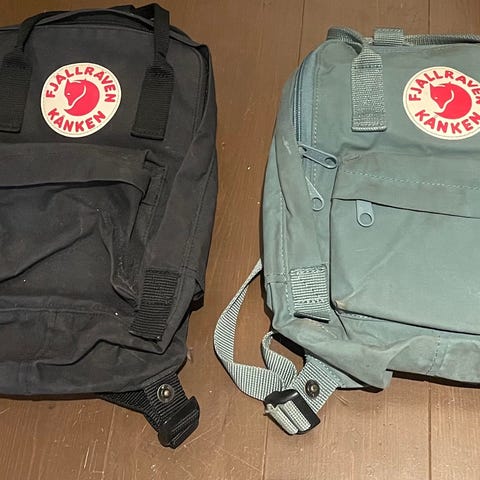 Säljer två stycken Fjällräven Kånken Mini i fina färger – en blå och en grön.