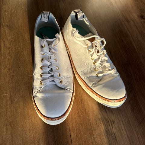 Ett par vita sneakers från Jack & Jones. Skorna har vita skosnören och en diskret logotyp på sidan. Sulan är i en kontrasterande brun nyans med mönster. Endast använda en gång. Innermått 29.0 Stl 46