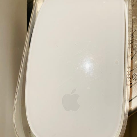Apple Magic Mouse trådlös mus i vit färg. Designad för användning med Mac-datorer och erbjuder pekgester för navigering och kontroll.