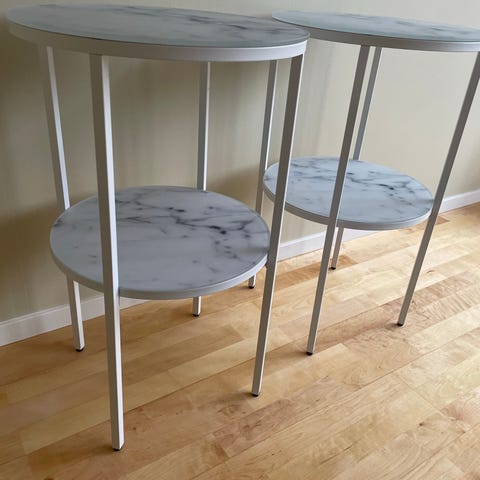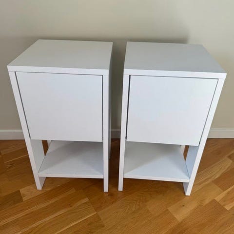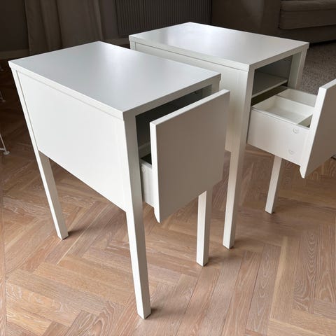 Säljer två vita sängbord från Mio i gediget trä. Rymlig låda och hylla för böcker/tidningar. Mycket gott skick bortsett från ett litet skavmärke i ett hörn (se närbild). Låddjup 10 cm. Bordsyta 45 x 40 cm. Höjd 65 cm.