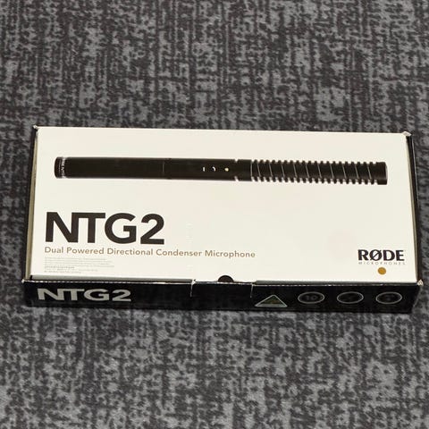 Røde NTG-1 mikrofon i svart utförande. Kondensatormikrofon av shotgun-typ, lämplig för riktad ljudupptagning vid till exempel film- och videoproduktion eller intervjuer. På bilden syns mikrofon med vindskydd, etui med Røde-logotyp samt originalförpackning.