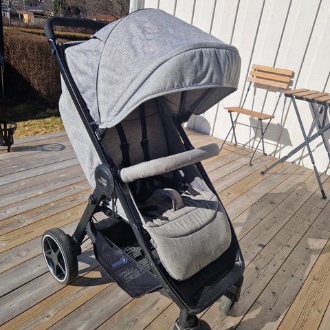 Britax barnvagn i svart tyg med ställbart ryggstöd och sufflett. Vagnen har fempunktssele, svängbara framhjul och varukorg under sittdelen. Handtag och frontbygel är klädda i material med läderlook. Passar ett barn att sitta eller ligga i under promenader och vardagsbruk.