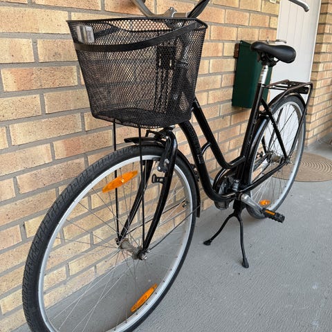 Rosa treväxlad damcykel som varit med om del, helt sned cykelkorg. Men den funkar som den ska om den får lite kärlek.
