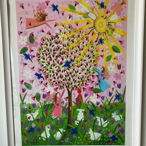Fin tavla för barnrummet med plansch med djur i träd, flerfärgad illustration 50 x 70 cm i Ikea ram med plexiskiva. Passar som väggdekoration i till exempel barnrum eller lekrum.