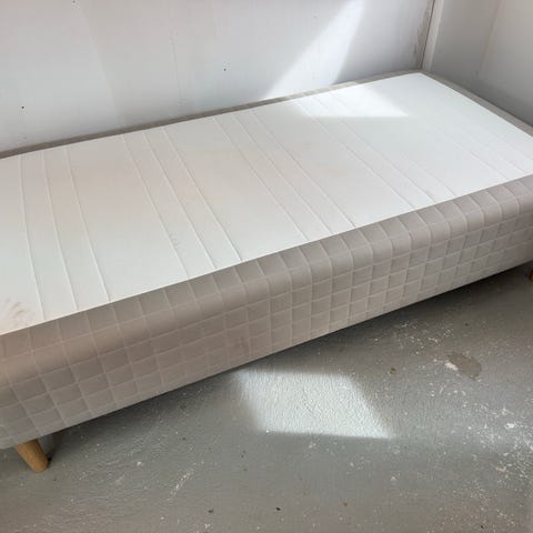 IKEA Sultan Singås säng i storlek 90x200 med ljus klädsel. Medföljer passande sängkappa / sängtopp i vitt (se sista bilden). Träben.