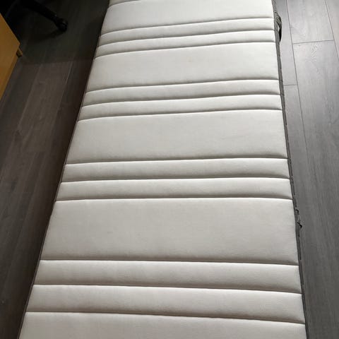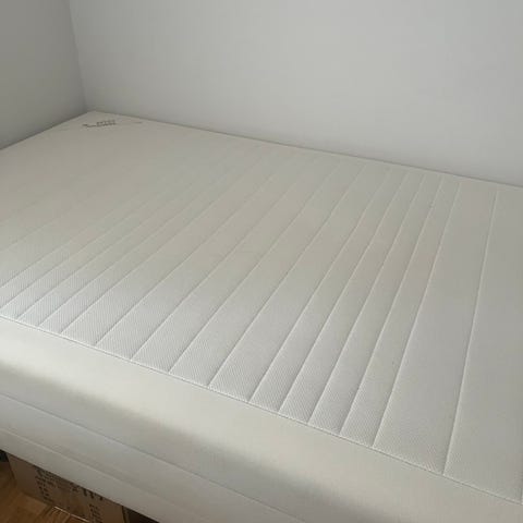 IKEA resårbotten i vit färg. Madrassbotten med längsgående quiltade kanaler. Placeras i sängram eller på ben för att användas som sängbas. Lämplig för en enkel sängplats i sovrum eller gästrum.