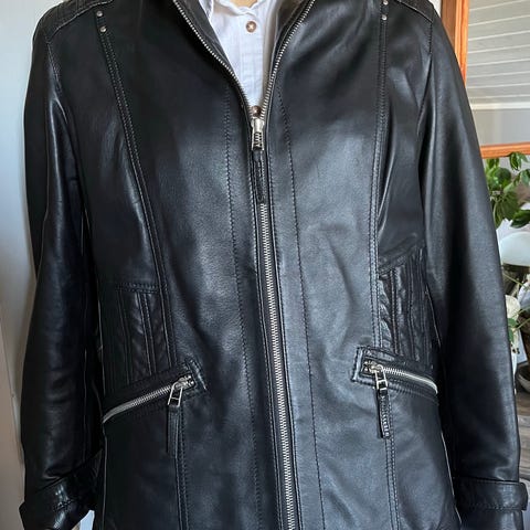 Jofama skinnjacka för dam i storlek M. Jackan är svart och tillverkad i läder. Modellen har dragkedja framtill, två snedställda framfickor med dragkedja samt vadderade partier vid axlar och ärmar. Passar som ytterplagg i vardagen eller vid motorcykelinspirerad stil. Bilderna visar även en svart skinnväst i liknande material med knäppning fram och flera fickor.