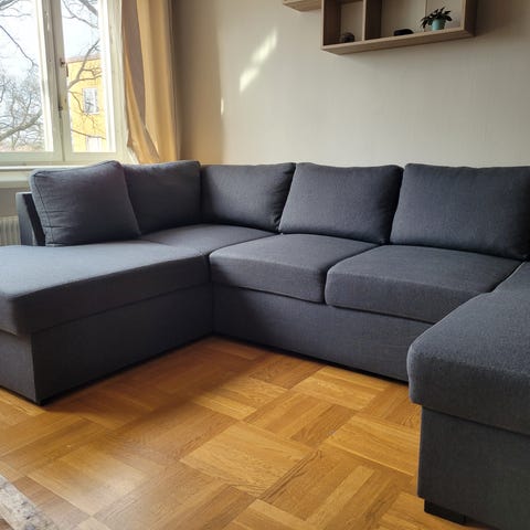 Fin bäddsoffa, tyget helt fläckfritt, som nytt. Extra schäslong 160 cm, dubbla förvaringslådor. Okänd fabrikör och ålder, men runt 5 år gammal gissar jag. Transport till lund eller Malmö kan ordnas för 500 extra.
