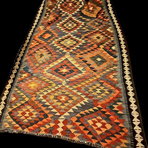Väldigt fin kelim matta. Köpt på auktion och varsamt använd. Dubbelsidig. Flatvävd persisk Harsin-kelim, ull på yllevarp, Kermanshah. Traditionellt mönster i jordfärger.
