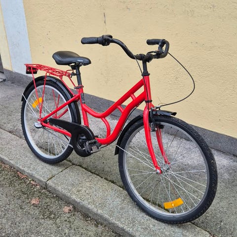 Biltema barncykel med 24" hjul. Cykeln har lågt insteg, fotbroms bak och handbroms fram. Utrustad med pakethållare bak, kedjeskydd, stöd och reflexer. Passar barn som behöver en cykel i 24-tumsstorlek för vardagscykling till skola och fritidsaktiviteter.