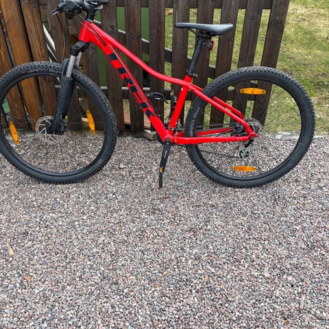 Trek mountainbike för unisex med ramstorlek S och 27,5" hjul. Cykeln har dämpad framgaffel, grovmönstrade däck och fotstöd.