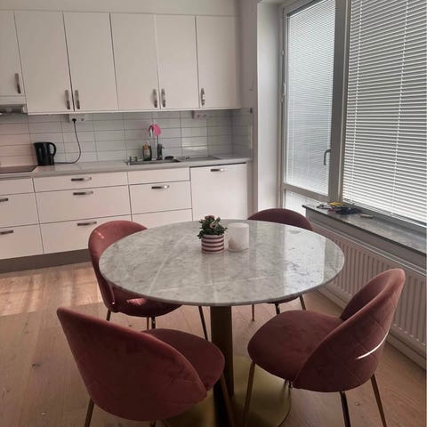 Matbord rund vit och 4 stolar i sammet gammelrosa färg