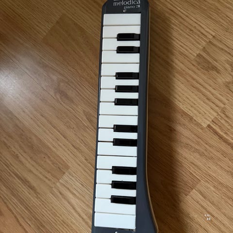 Melodika med vit och svart klaviatur. Instrumentet spelas genom att blåsa i ett munstycke samtidigt som tangenterna trycks ned. Passar för övning av grundläggande klaviaturspel och melodispel, exempelvis i hemmet eller i undervisningssammanhang.