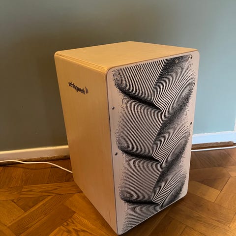 Pearl cajon trumma i vit/svart färg. Låter fantastiskt. Och har ett virvel ljud på framsidan (kedjorna syns på bild). Medföljer vadderad mjuk väska med bärhandtag och dragkedja, anpassad för transport och förvaring av cajonen.