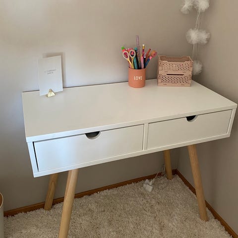 Rosa skrivbord med tillhörande stol för barn. På bordsskivan finns synliga märken, vilket framgår av bilden. Annars i väldigt gott skick. Pris kan diskuteras vid snabb hämtning. Hämtas på Råbylund i Lund.