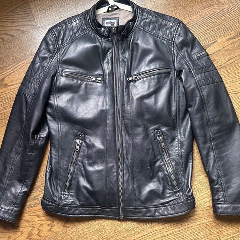 Harley-Davidson skinnjacka för herr i storlek L. Jackan är svart och tillverkad i läder med quiltat innerfoder. Utsidan har flera dragkedjeförsedda fickor och vadderade partier på axlar och ärmar. Baksidan har Harley-Davidson-tryck. Till jackan hör ett separat ryggskydd med justerbara remmar och midjebälte samt skinnbyxor storlek 52. Passar som motorcykeljacka eller som robust ytterjacka i läder.
