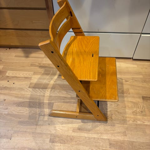 Stokke Tripp Trapp matstol i gulmålat trä. Klassisk justerbar barnstol där sittyta och fotstöd kan flyttas i höjd och djup för att anpassas efter barnets storlek. Stolen är utformad för att barnet ska kunna sitta vid ett vanligt matbord. Passar från småbarnsålder upp till större barn och även vuxna inom viktgränsen som gäller för modellen. Färgslitage och märken i lacken förekommer, se bilder för skick.