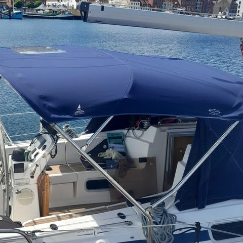 Rejäl sprayhood och sittbrunns kapell. Sittbrunnskapellet går ända ut till reling. Men det finns inga sidor, enbart tak. Bågarna är av rejält rostfritt material och tyget är i fint skick. Det har suttit på en Bavaria cruiser 41 som är 3,95m bred. Säljes tillsammans.