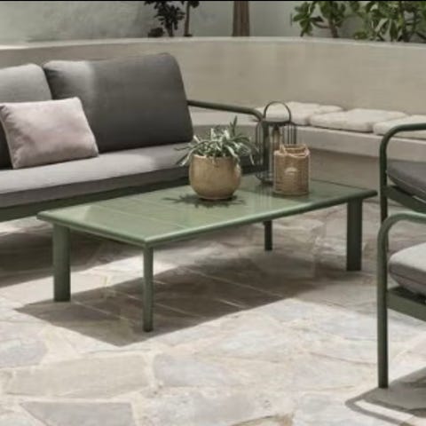 Loungegrupp för utomhusbruk bestående av modulsoffor och tillhörande pall. Stommen är i mörkgrå metall med ribbad sits och rygg. Dynorna är tjocka och ljusa, med separata sitt- och ryggdynor. Gruppen kan ställas som hörnsoffa med tillhörande fåtölj eller som flera fristående moduler. Passar uteplats, altan eller trädgård för sittgrupp och avkoppling.