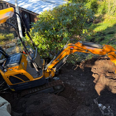 En smidig lätthanterlig minigrävare. Står lastad på ett släp. Tre olika skopor följer med. Perfekt för jobb i trädgården.