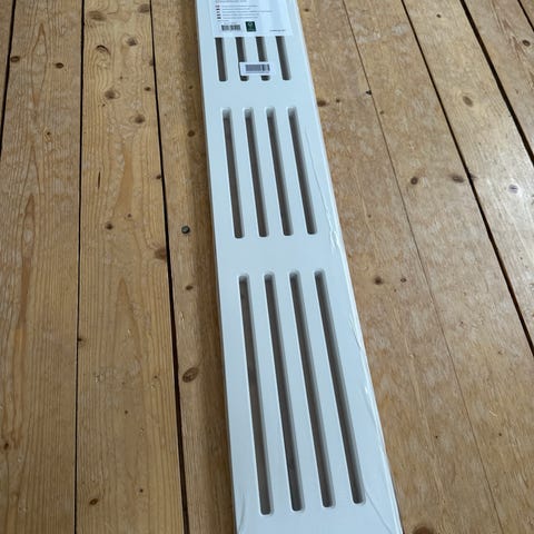 Elementskydd i vit färg med rutmönstrad front. Överdraget är avsett att placeras framför ett element för att dölja det och skapa en enhetlig väggyta. Konstruktionen har genomsläppligt mönster som möjliggör luftcirkulation. Levereras med lösa lister och beslag enligt bilderna, avsedda för montering runt elementet och under fönsterbrädan.