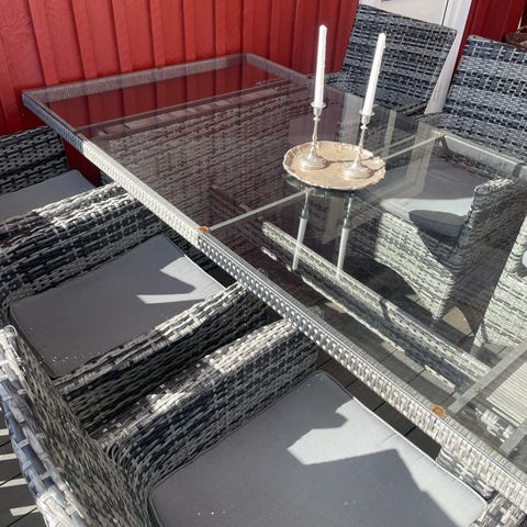 Utemöbelgrupp i konstrotting bestående av runt bord med glasskiva (diameter 150 cm)och snurrbricka samt 8 fåtöljer med fällbara höga ryggar. Möbelgruppen är grå/beige med grå dynor. Passar för uterum, altan eller trädgård som mat- och sällskapsgrupp. Stolarna har armstöd och är utformade för god sittkomfort. Materialet är anpassat för utomhusbruk och är lätt att torka av.