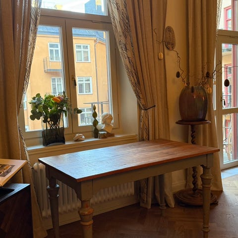 Bordet är cirka 10 år gammalt och har fått lite patina och charm men kommer kunna leva i generationer framåt. Vacker t.ex som prydnad i en herrgård, sekelskiftesvåning, orangeri, matsal eller i ett stort lantligt kök. Rymmer 8-10 personer utan problem.
