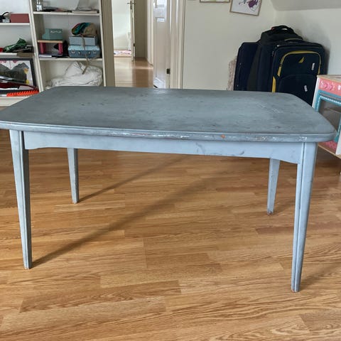 Äldre matbord i massivt trä, målat i ljusblå nyans. Fin patina. Passar som matbord inomhus eller kanske i ett växthus? Två liäggsskivor medföljer. Mått 112*87cm, med iläggsskivor 180*87cm