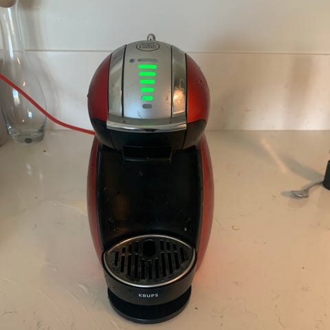 Dolce Gusto kapselmaskin i svart och vitt utförande. Maskinen använder kapslar för att brygga kaffe och andra varma drycker. Vattentanken är placerad på baksidan och är avtagbar för enkel påfyllning och rengöring. Droppbrickan framtill är avtagbar för att underlätta rengöring och anpassning till olika koppstorlekar. Maskinen ansluts med vanlig stickkontakt och har reglage på ovansidan för att starta och styra bryggmängd.